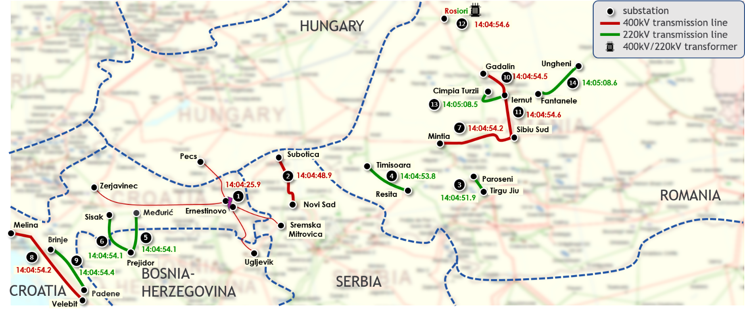 The separation of flows in the Ernestinovo substation, lead to the shifting of electric power flows to neighbouring lines which were subsequently overloaded. At 14:04:48.9, the line Subotica – Novi Sad (Serbia) tripped due to overcurrent protection. This was followed by the further tripping of lines due to distance protection, as shown in Figure 2, below, leading eventually to the system separation into two parts at 14:05:08.6.